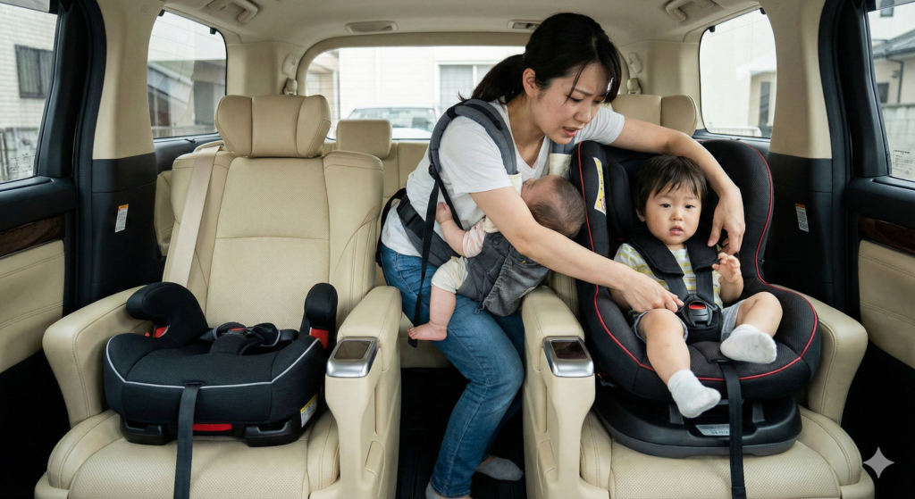 3人のお子さんを乗せるとなると、車内レイアウトの工夫は必須です。特にチャイルドシートの配置は、子どもの安全と乗り降りのしやすさに直結する重要な問題です。ここでは、私が実際にアルファードに乗ってみて、どのようにチャイルドシートを配置し、荷物問題を解決したか、その実体験をレビューします。