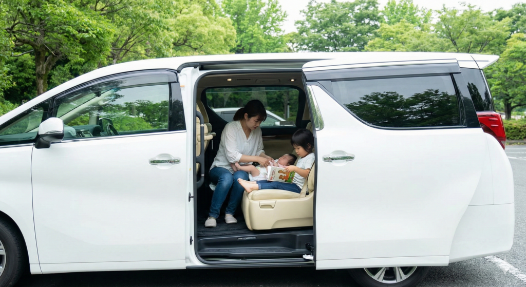また、車内でミルクを作ったり、おむつを替えたりする際にも、その広さが威力を発揮します。このように、アルファードは単なる移動手段としてだけでなく、緊急時の「移動式休憩室」としても機能してくれるのです。