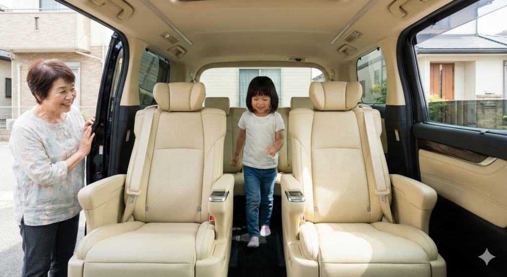 3人のお子さんを乗せての送迎は、乗り降りのスムーズさが何よりも重要です。アルファードは両側電動スライドドアが標準装備されているため、狭い駐車場でも隣の車を気にすることなく、ドアの開閉ができます。
