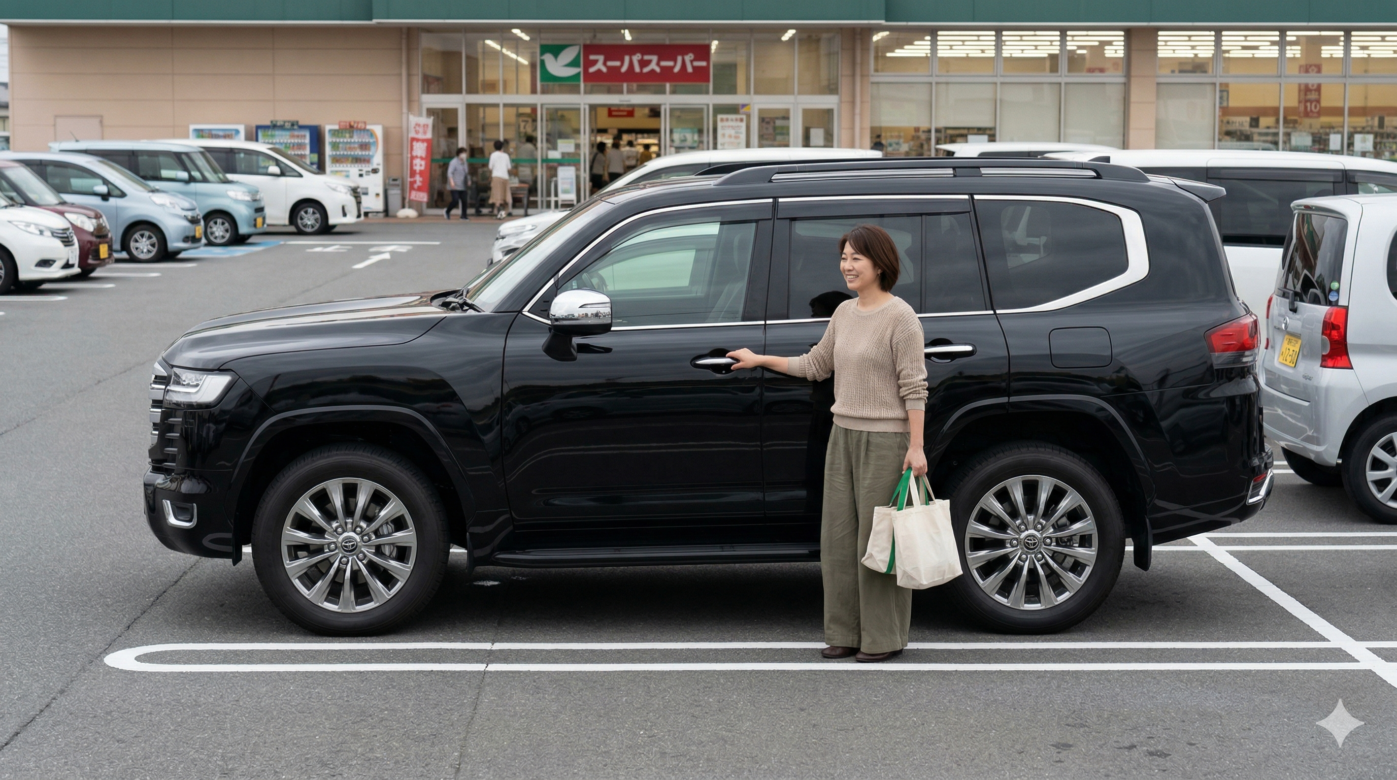 ランドクルーザー300の場合、全幅は1,990mm。これは軽自動車(全幅1,475mm)と比較すると、左右に25cmずつ、合計で50cm以上も広い計算になります。 この「50cmの差」が、普段使いのスーパーの入り口や、住宅街のクランク路で大きなプレッシャーとしてのしかかります。 ステアリングを回す力については、最新の電動パワーステアリングにより、指一本でも回せるほど軽く進化しているため、筋力的な不安は皆無と言っていいでしょう。