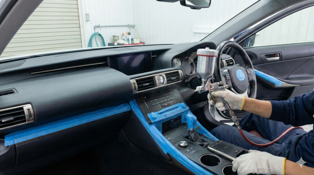 プロが行うダッシュボードの再生リペアは、もはや芸術の域に達しています。 まず、劣化したベタベタの旧塗膜を、下地を傷めない特殊な溶剤で完全に除去します。 この洗浄工程が最も重要で、ここで少しでも劣化層が残っていると、後の塗装がすぐに剥がれてしまう原因になります。 次に、ひび割れがある場合は専用の充填パテで埋め、周囲のシボ(模様)に合わせて成形します。