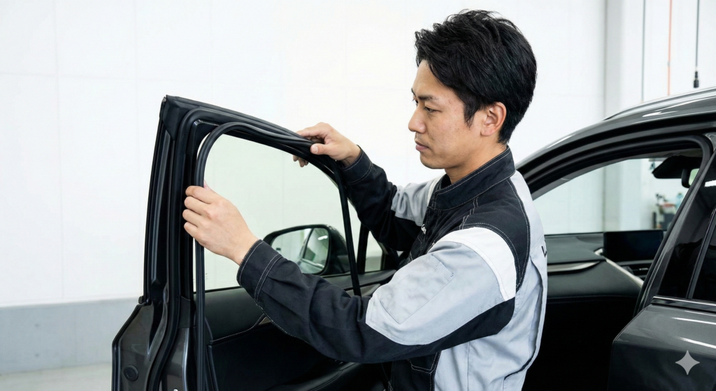 ウェザーストリップの交換は、最も劇的な効果をもたらす修理です。 NXのウェザーストリップは、部位によって硬さの異なるゴムを使い分ける「2色成形」や、摩擦を抑える特殊コーティングが施された非常に高価なパーツです。 新品に交換することで、劣化したゴムでは失われていた「反発力」が復活し、ドアが車体に吸い付くような密閉感が生まれます。