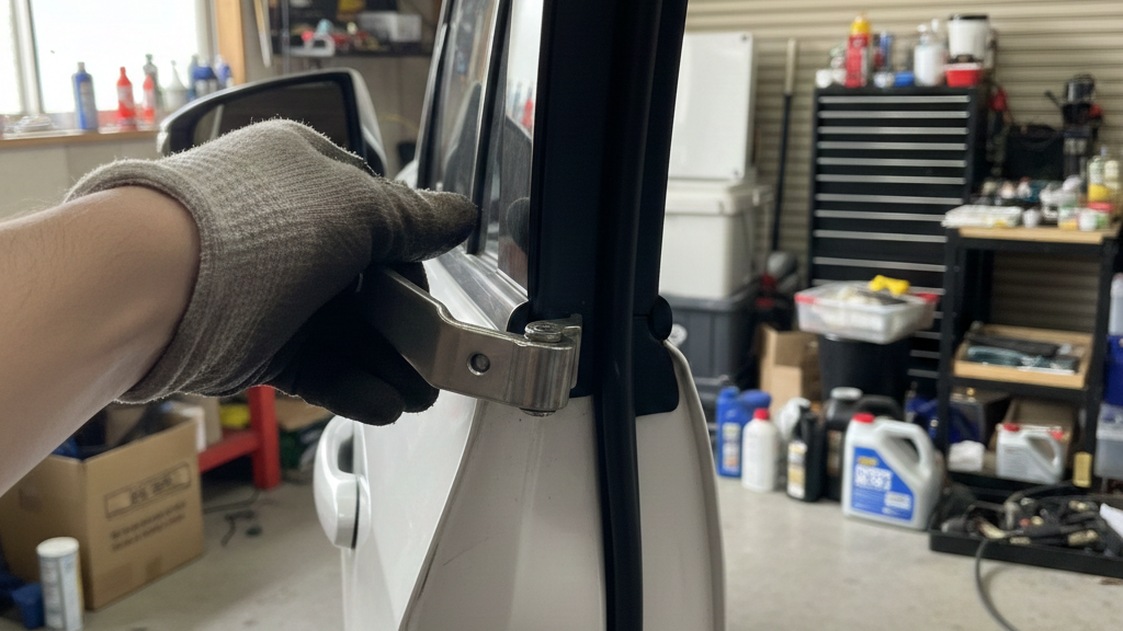 車体側とドア側のヒンジ固定ボルトを慎重に外し、古いヒンジを取り外します。 - 新品ヒンジの取り付けと仮締め
